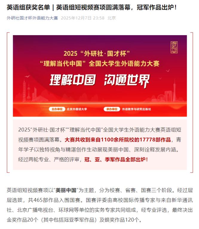 此次获奖充分展现了我校学子扎实的跨专业素养与出色的外语创新实践能力,体现了我校在外语人才培养与学科建设方面的扎实成效。学校将继续坚持以赛促学、以赛促教,不断拓宽学生实践平台,增强跨文化沟通能力,为培养更多高素质应用型人才贡献力量。