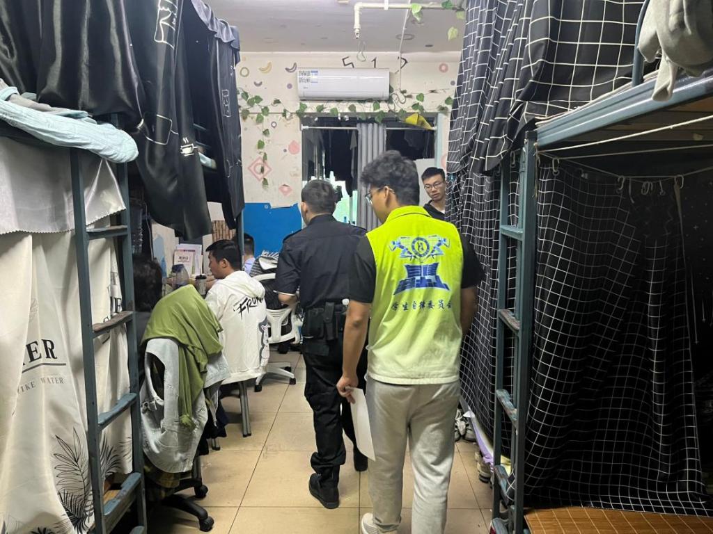 下午,学工部、保卫处开展了学生社区消防安全隐患大检查,全体人员深入社区,进入寝室,针对消防安全疏散通道是否畅通、用电是否规范、易燃区域能否有效防止火灾、消防设施设备是否完好等情况展开了全面检查。