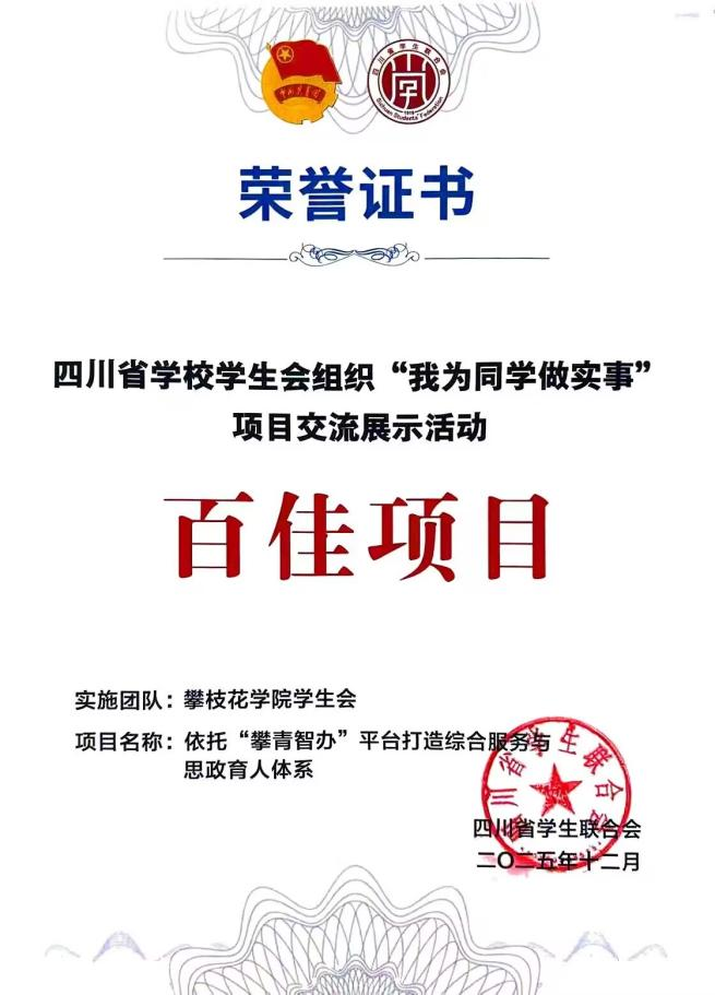 12月15日,由共青团四川省委、四川省学生联合会主办,西南石油大学团委、成都市学生联合会承办的2025年四川省学校学生会组织“我为同学做实事”项目交流展示活动在西南石油大学圆满落幕。我校学生会“依托‘攀青智办’平台打造综合服务与思政育人体系”项目获全省“百佳项目”荣誉称号。