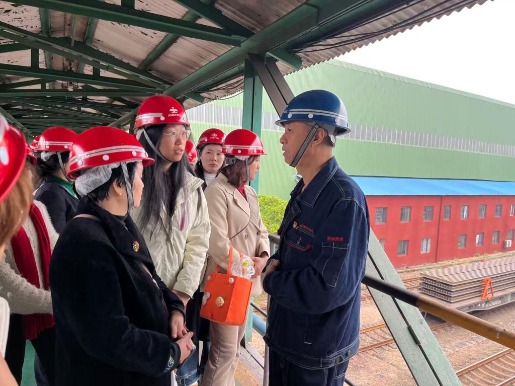 活动人员首站走进攀钢轨梁场,在攀钢专业讲解员的带领下,深入钢轨生产车间,聆听了生产线的发展历程与技术创新,实地观摩了现代化钢轨制造流程,亲身感受到钢铁工业的智能制造实力与精益管理水平。