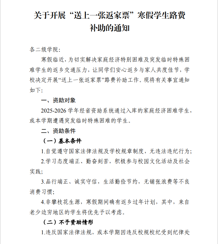 12月15日,学校启动“送上一张返家票”寒假路费补贴活动。根据学生家庭经济困难程度和返乡距离,学校为263名困难学生发放路费补贴共计3万余元,有效减轻其返乡经济负担。